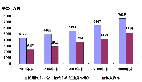 據公安部交通管理局最新消息,截至2009年底,我國汽車保有量已達到6200萬輛。如果把三輪汽車、低速貨車、農用車包括在內,截至2009年底,我國民用汽車保有量已達7619萬輛,比上年末增長17.8%。其中私人汽車保有量5218萬輛,增長25.0%;民用轎車保有量3136萬輛,增長28.6%,其中私人轎車2605萬輛,增長33.8%。